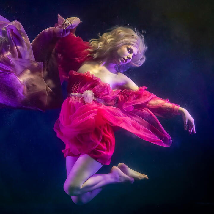 Dreamlike underwater images where body and water merge in a poetic play of light and motion.